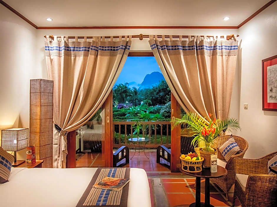 Spacious suite features a wrap-around private balcony with views of the pool and the mountain one side, and the Nam Song River on the other. It has a flat-screen cable TV, a mini-bar and an electric kettle. An private bathroom comes with a bathtub, free toiletries and a hairdryer. A bathrobe and slippers are provided.
